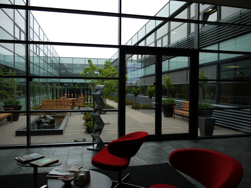 ロビーからはガラス越しに中庭が見える。中庭の回りに研究部門が配置されているという。現代風の美しいデザインの建物だ。